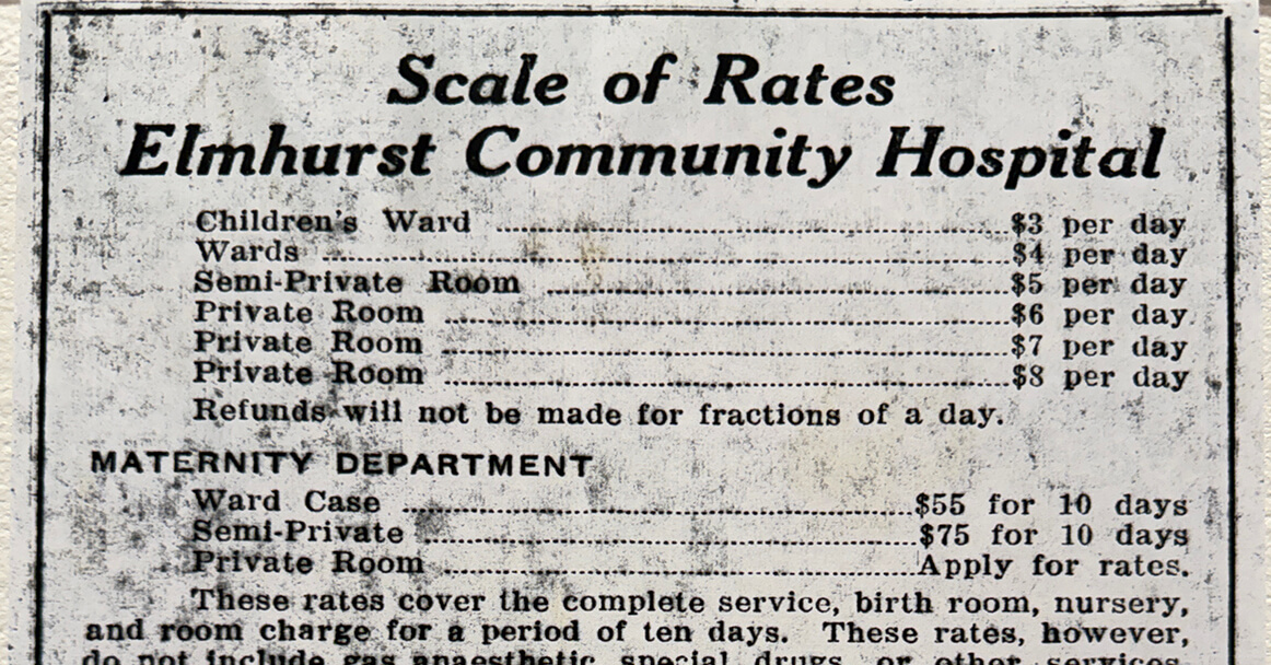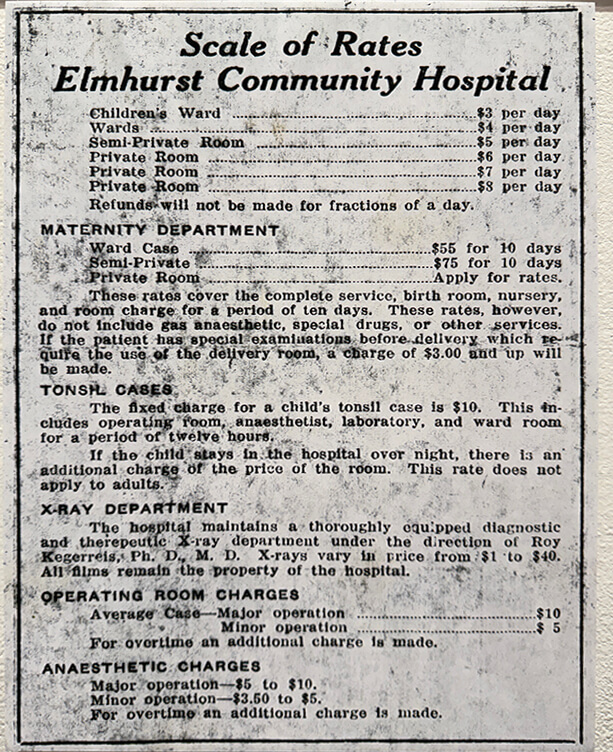 Aside from the company, my favorite part of the healthcare exhibit was the price list from then-Elmhurst Community Hospital circa 1926:
